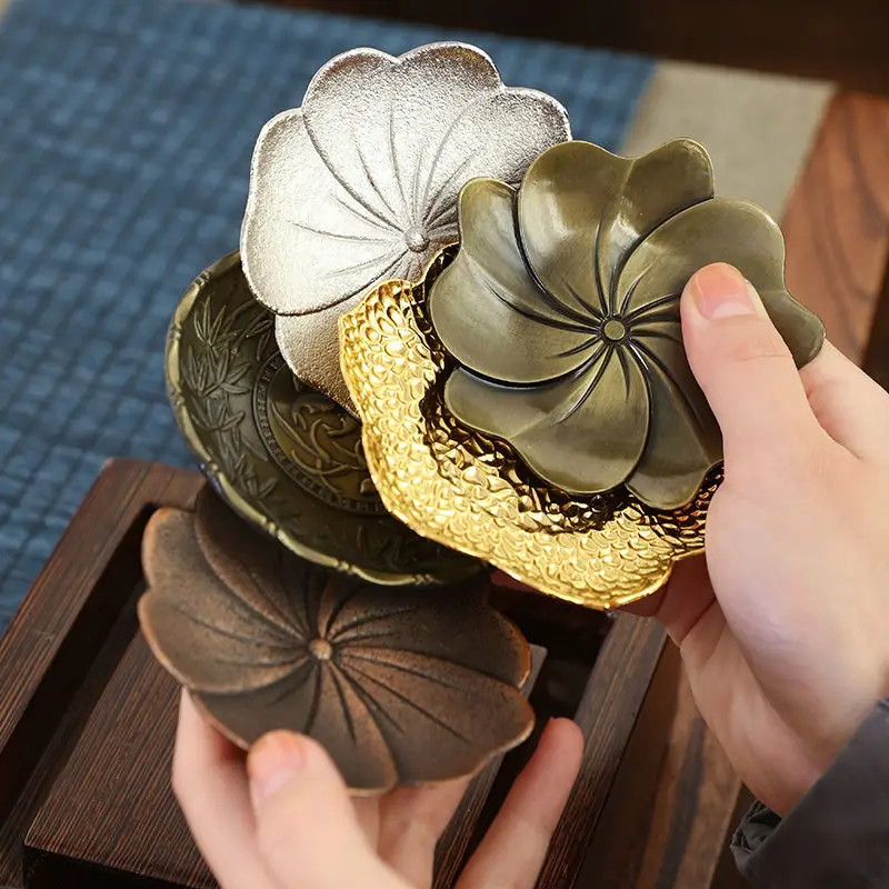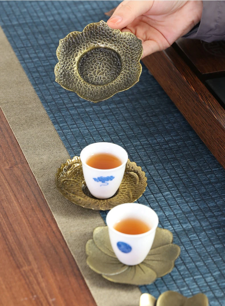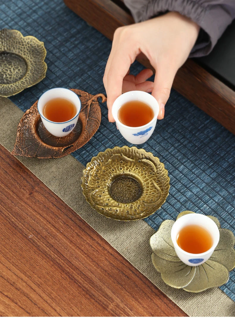 This alloy tea cup coaster protects surfaces from heat and moisture. The metal base stays stable and resists slipping on most tabletops.